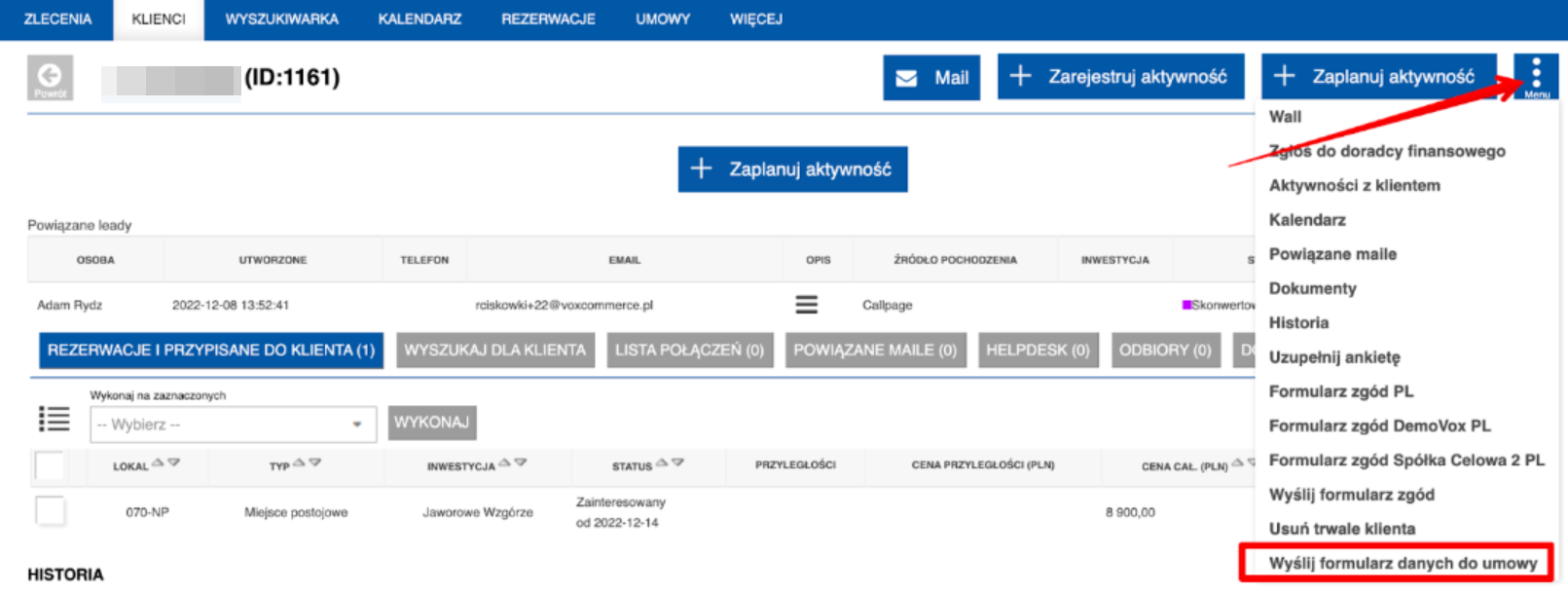 W karcie klienta dostępna jest opcja “Wyślij formularz danych do umowy” za pomocą której można wysłać do klienta link do formularza aby to klienta sam podał potrzebne dane.