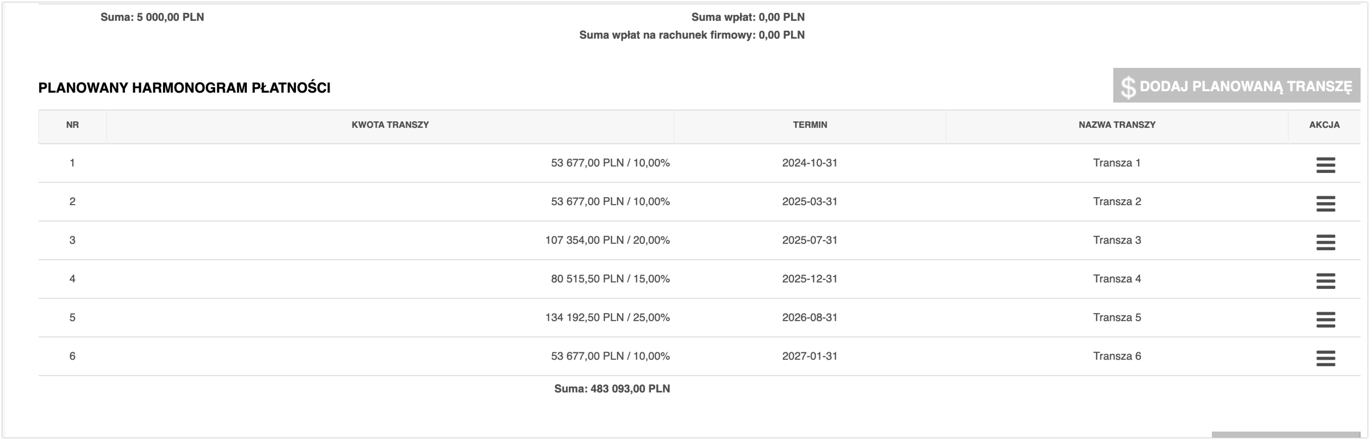 W karcie umowy dodaliśmy opcję wygenerowania i wysyłki dokumentu z szablonu z poziomu transzy. W szablonie można zastosować zmienne generujące informacje dotyczące nazwy/kwoty/terminu transzy, sumy dotychczasowych wpłat oraz kwoty pozostałej do zapłaty.