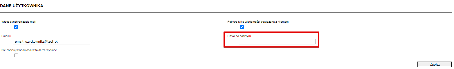 W tym polu powinno zostać wprowadzone hasło do skrzynki pocztowej, a nie (jak to najczęściej bywa) hasło do konta w systemie VoxCRM.